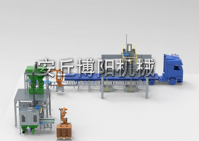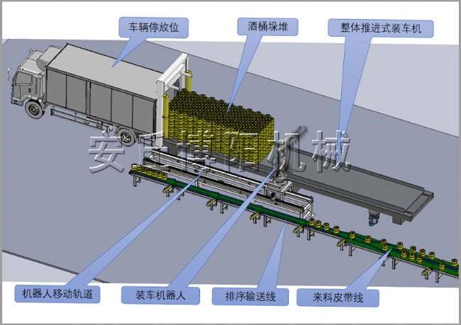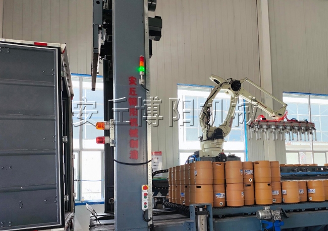 集裝箱全自動裝車機解決方案:用于桶裝、袋裝、紙箱等的碼垛裝車,應用車型:平板、集裝箱、貨柜等。