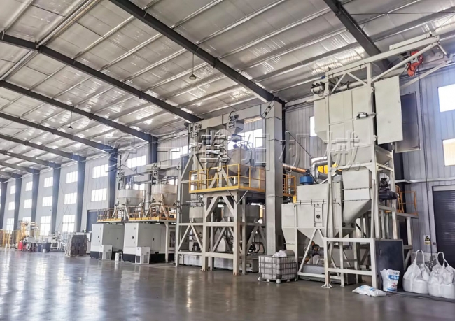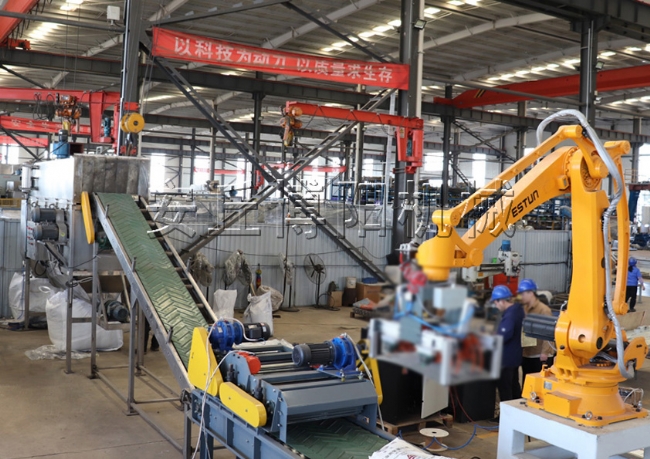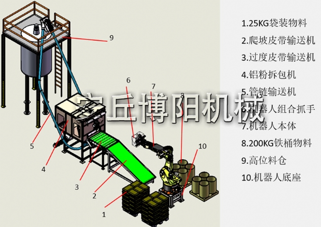 桶裝鋁粉拆垛機器人+自動拆包機+管鏈輸送機上料系統
